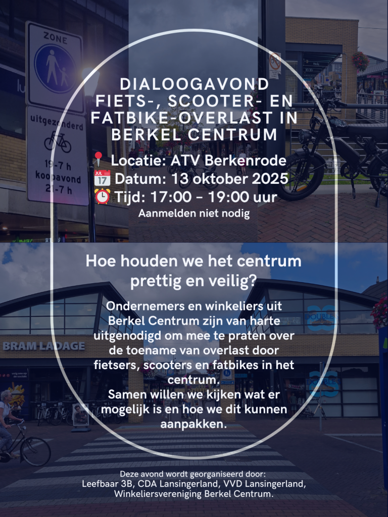 Ondernemers en winkeliers (maar ook omwonenden) uit Berkel Centrum zijn van harte uitgenodigd om mee te praten over de toename van overlast door fietsers, scooters en fatbikes in het centrum.